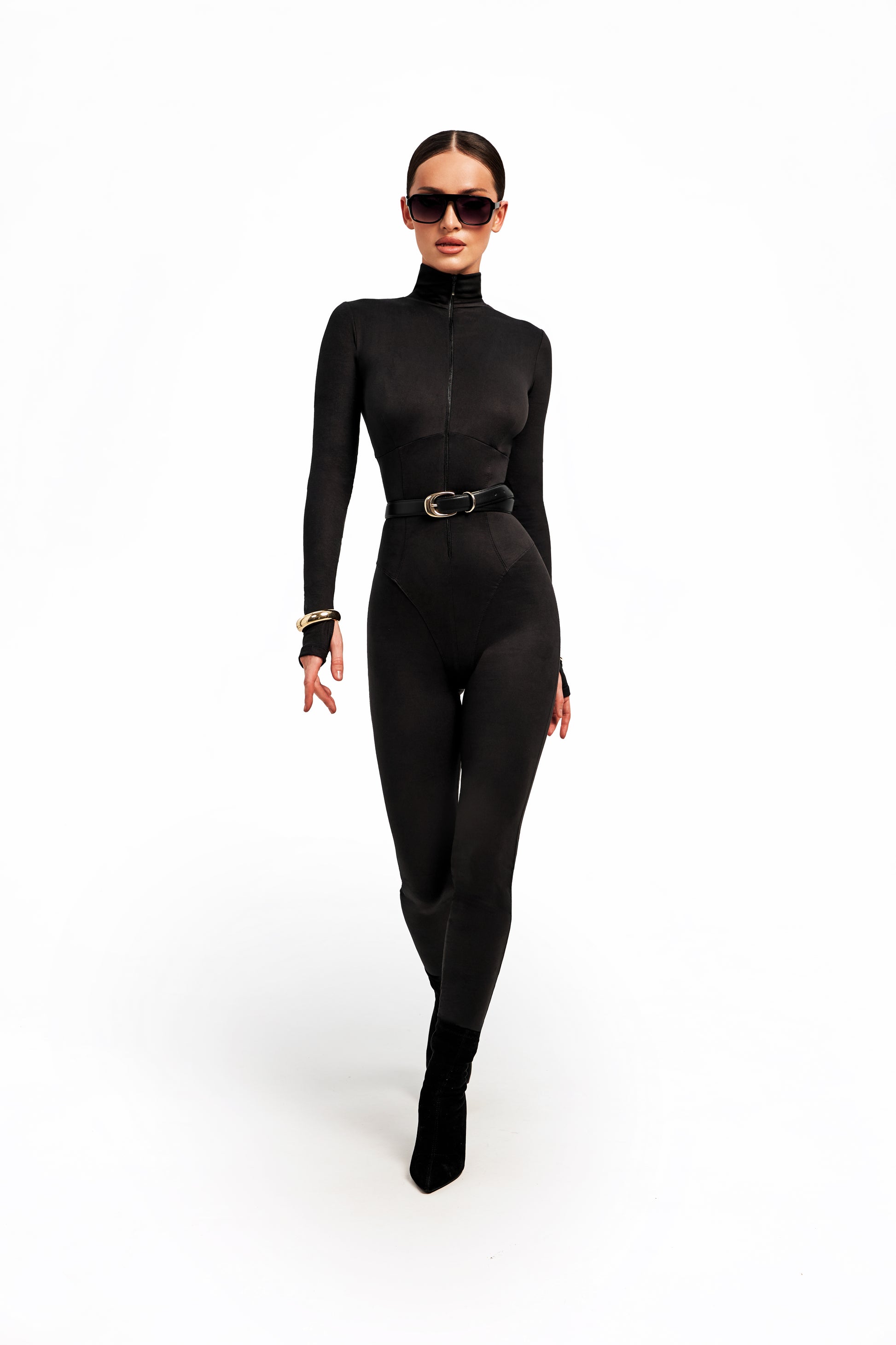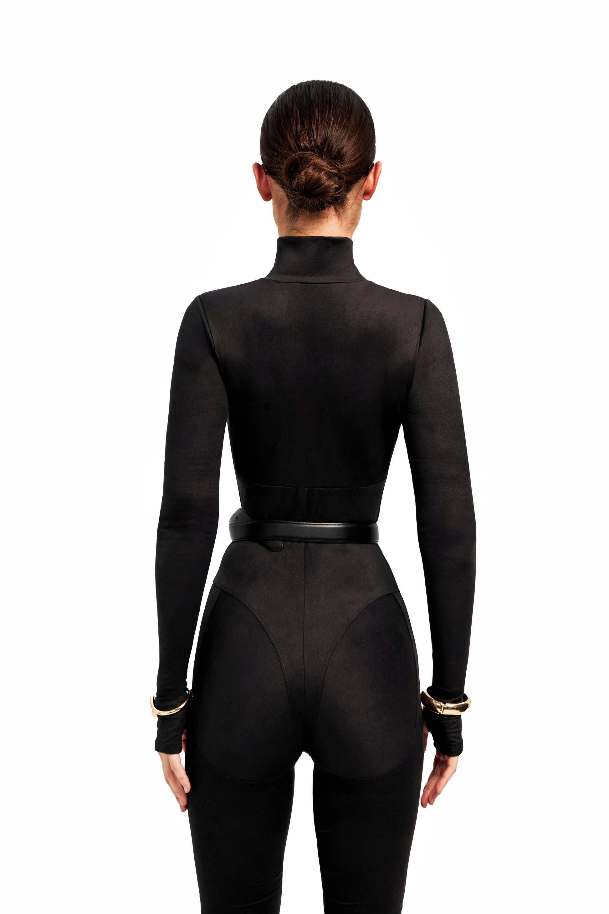 Комбінезон, що притягує всі погляди: виготовлений з преміальної еластичної замші чорного кольору, який просто вимагає уваги. Архітектурні рельєфні шви динамічно моделюють і підкреслюють вигини тіла, а зухвала деталь у вигляді імітації трусиків створює безкомпромісно сучасний і провокаційний силует. Розкішна замша відчувається як друга шкіра, дарує абсолютний комфорт і повну свободу рухів завдяки винятковій еластичності.